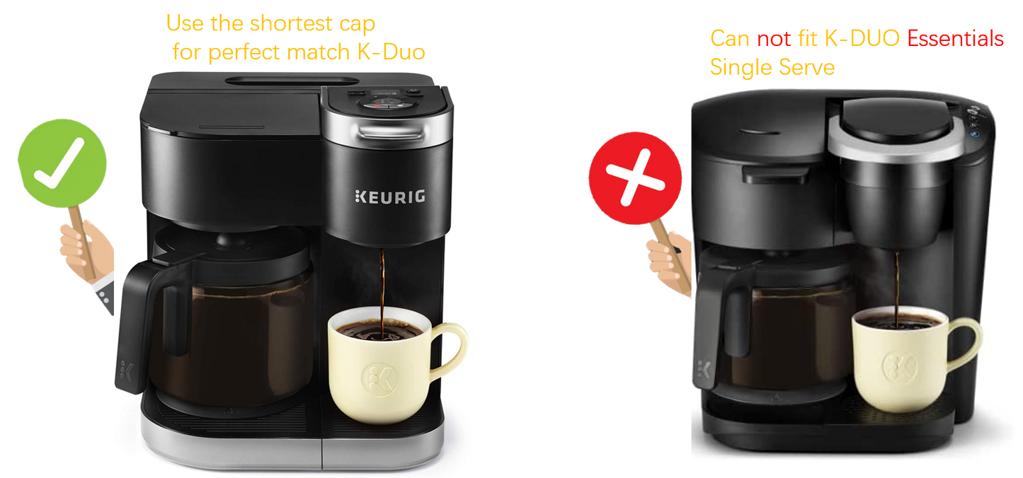- Designed to fit the Keurig K-Duo Coffee Maker. DOES NOT WORK WITH K-DUO ESSENTIALS MODEL. What is the difference between the Keurig K duo and Keurig duo essentials? K-Duo Essentials only have 3 sizes for K-cup and carafe. However, K-DUO has 4 brew sizes for K-cup and carafe.